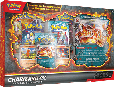 Charizard ex brengt de duisternis! Met zijn explosieve aanvallen en indrukwekkende HP is Charizard ex een kracht om rekening mee te houden op het slagveld. Evolueer vanuit Charmander en Charmeleon en benut zijn krachtige Ability en aanvallen om een verwoestende comeback te maken. Deze speciale collectie bevat vijf Pokémon TCG-boosterpakjes en een oversized lenticulaire kaart van Charizard ex—beweeg de kaart heen en weer om Charizard in actie te zien!