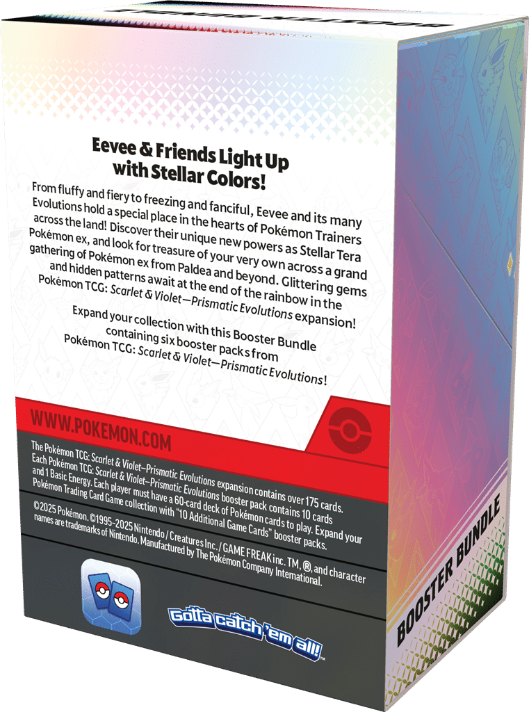 Verhoog je Pokémon TCG-ervaring met de Pokémon Prismatic Evolutions Booster Bundel! Deze bundel bevat meerdere Prismatic Evolutions booster packs, perfect voor verzamelaars en spelers die hun deck willen versterken en nieuwe, krachtige kaarten aan hun collectie willen toevoegen. Ontdek de nieuwste kaarten met Eevee en zijn evoluties in de hoofdrol en bereid je voor op spannende gevechten en strategische mogelijkheden.