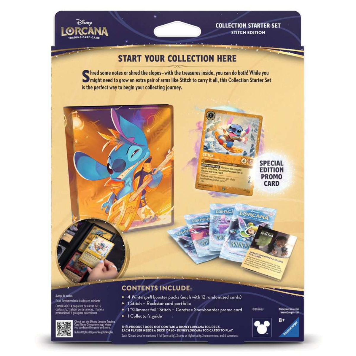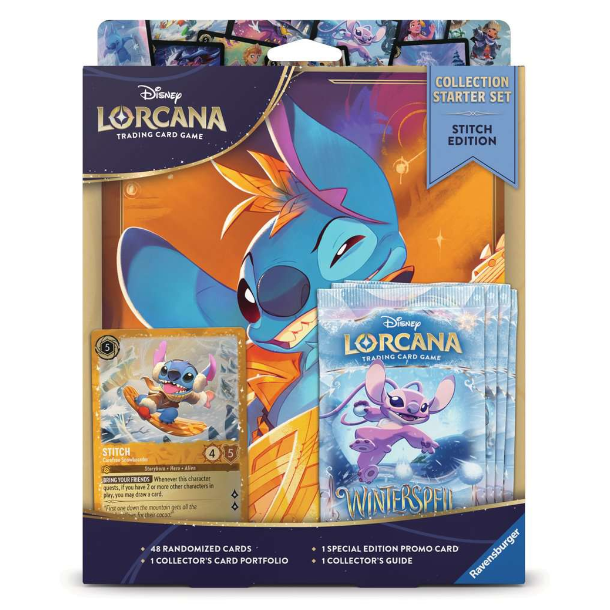 In de Winterspell Collection Starter Set Stitch vind je vier Winterspell booster packs, samen goed voor 48 kaarten. Daarnaast zit er een Stitch portfolio bij die ruimte biedt voor maximaal 80 kaarten. Ook zit er een glimmer foil Stitch promo kaart in de set en een collector’s guide die je helpt om overzicht te houden over de set en het verzamelen.